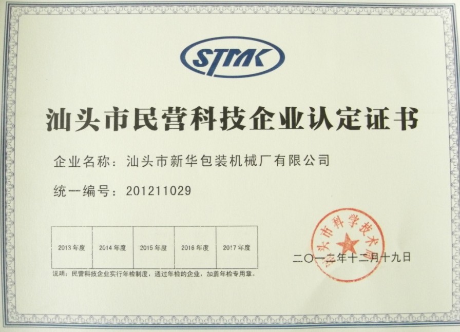 2012年12月19日,汕頭市新華包裝機(jī)械廠有限公司被汕頭市科學(xué)技術(shù)局認(rèn)定為“汕頭市民營科技企業(yè)”。